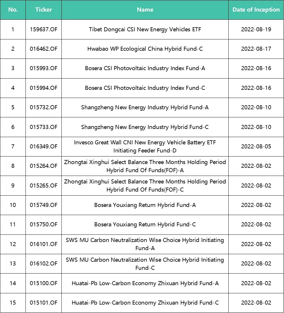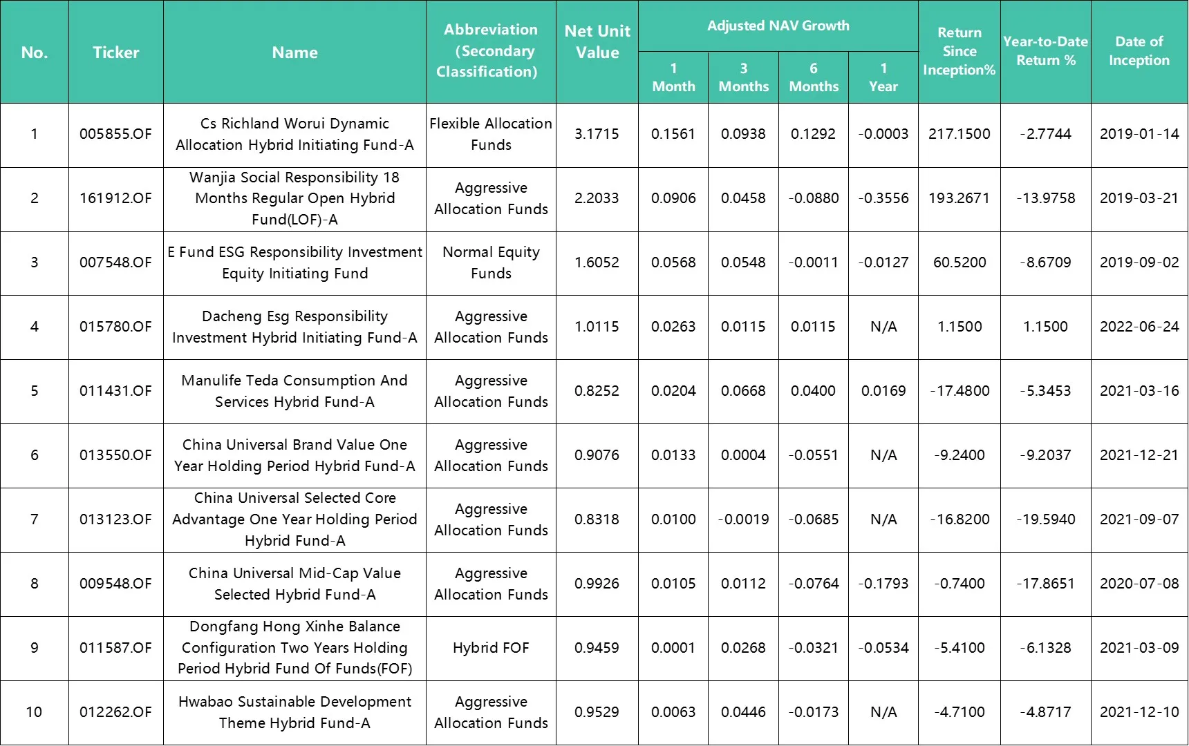 Note: This list screens the top 10 ESG funds by the percentage of peer group fund interval returns. The peer group funds include Equity Blend, Common Equity, International (QDII) Equity, Flexible Allocation, Enhanced Index, Passive Index, and Balanced Blend funds.